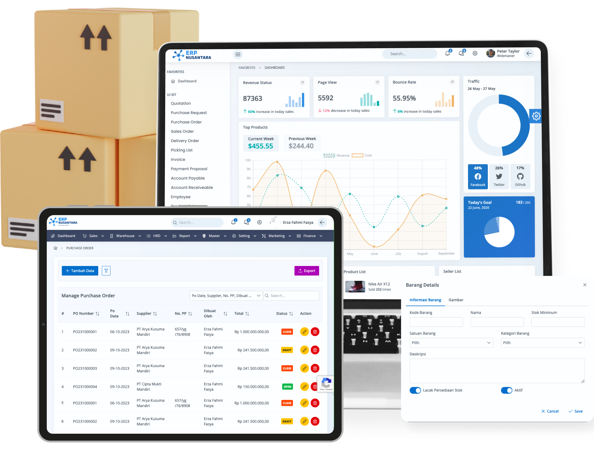 ERP Nusantara mengintegrasikan semua aspek bisnis perusahaan dalam satu sistem: produksi, pasokan, persediaan, keuangan, SDM, penjualan, dan pemasaran. Ini meningkatkan efisiensi dengan mengoptimalkan sumber daya dan mengurangi kesalahan.