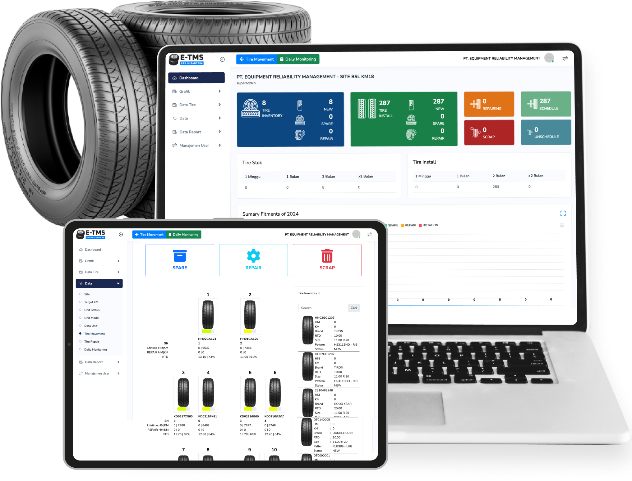 E-Tyre merupakan perangkat lunak yang mengoptimalkan penggunaan dan pemeliharaan ban. Ia melacak data ban, memprediksi masa pakai, menganalisis kinerja, dan mengurangi biaya operasional.